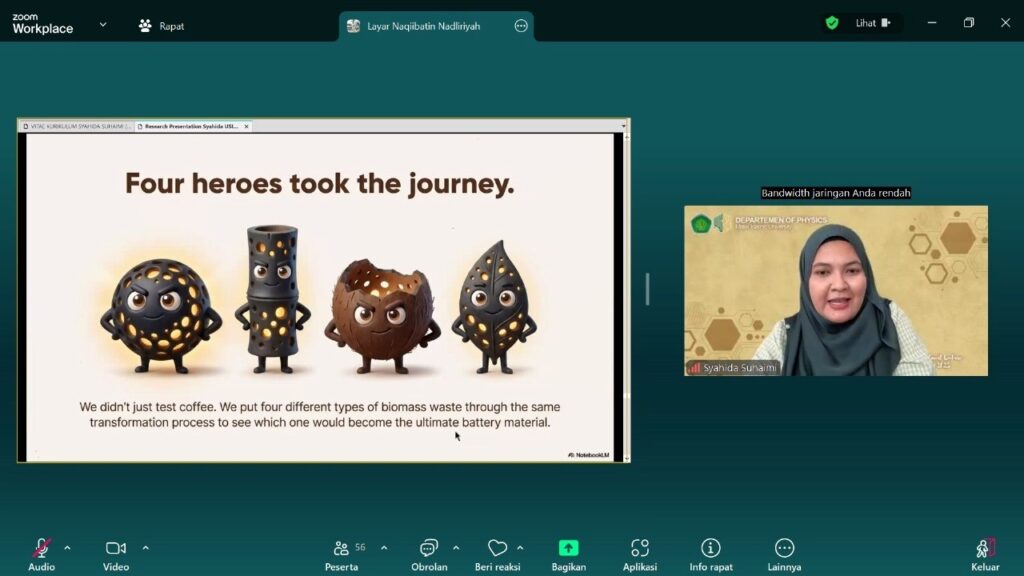 Sebagai narasumber utama, Prodi Fisika menghadirkan Dr. Syahida Suhaimi, Kepala Program Studi Applied Physics Universiti Sains Islam Malaysia (USIM). Dalam pemaparannya, Dr. Syahida menjelaskan hasil riset pengembangan material energi hijau, khususnya pemanfaatan limbah sebagai bahan baku *activated carbon* untuk meningkatkan performa baterai.